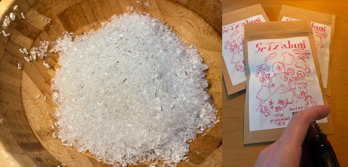 エッセンシャルアロマオイルとエプソムソルト(塩化マグネシウム)を使用。